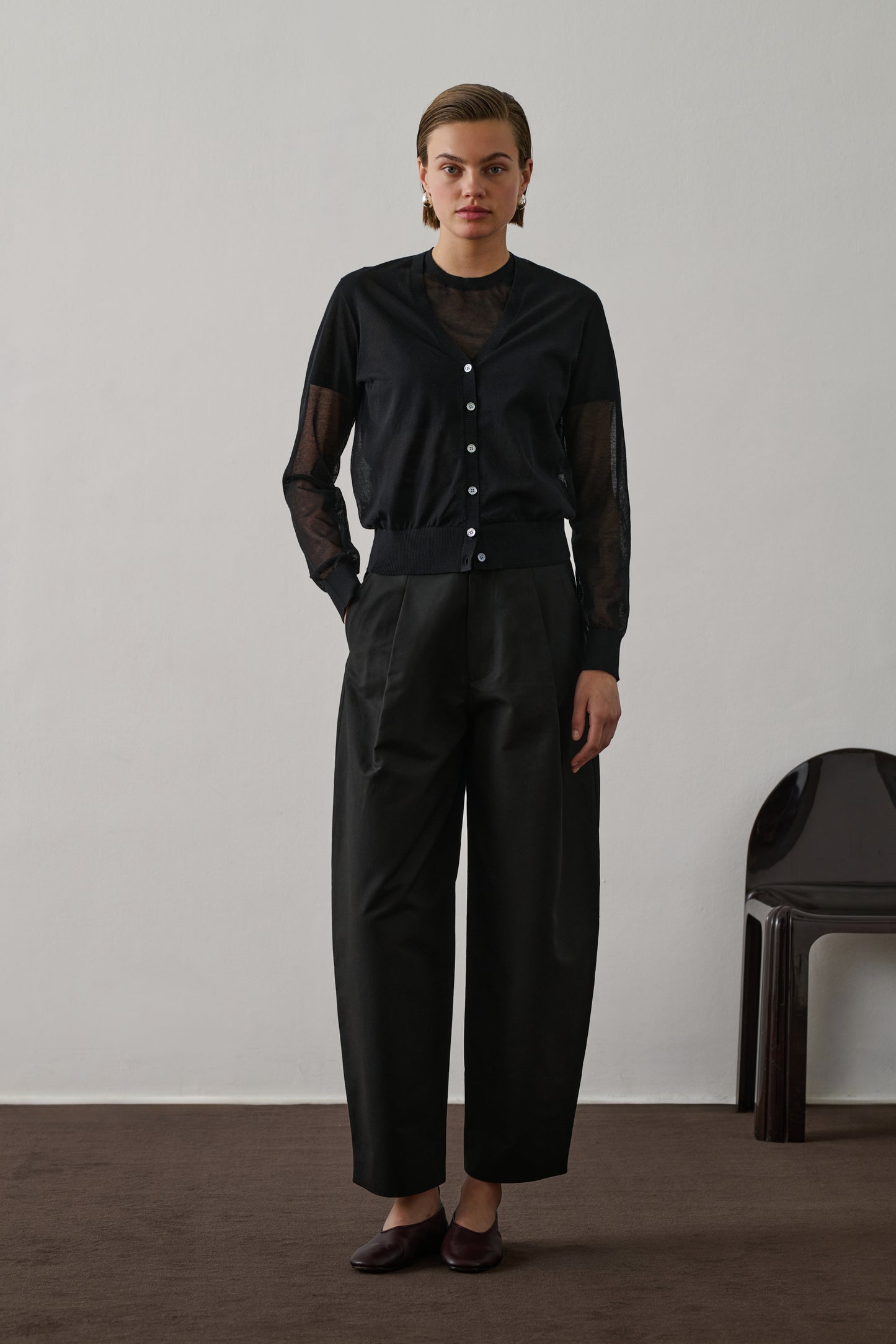 ETRETAT est un cardigan tricoté dans une maille ultra fine. Transparent, il se porte à même la peau ou en superposition avec un top habillé ou décontracté en fonction de l'allure souhaitée.