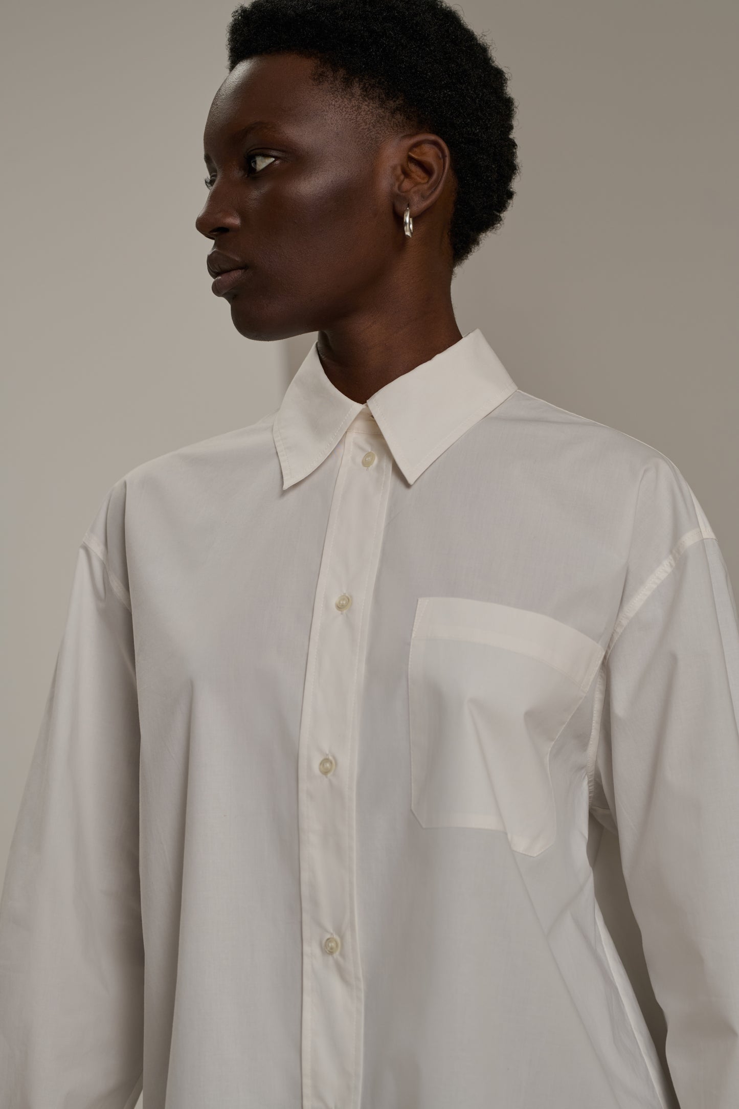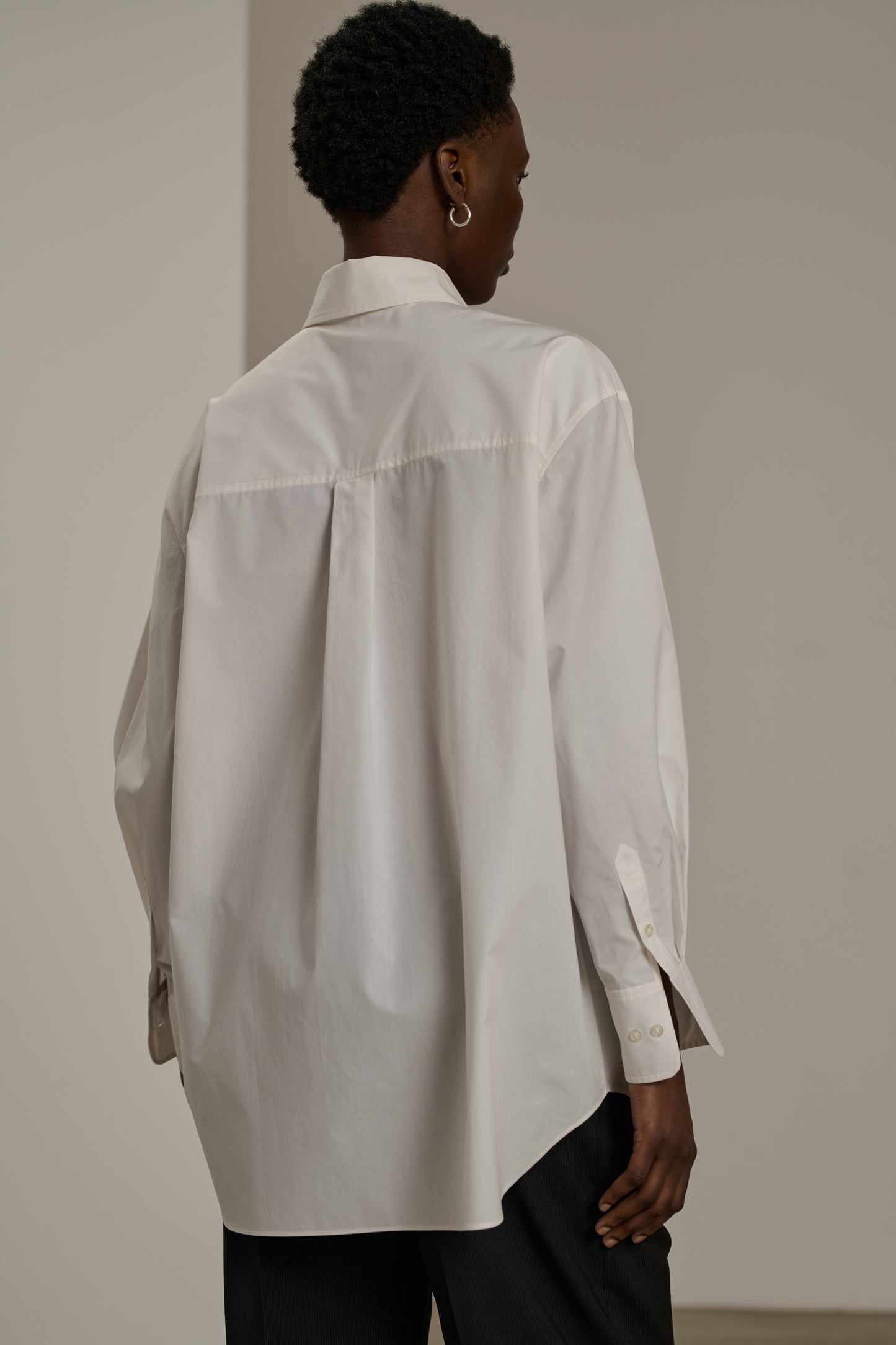 CARLOTTA est une chemise en popeline blanc cassé qui joue sur une coupe oversize inspirée du vestiaire masculin, pour un style décontracté et élégant.